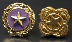 Gold Star status comes with the awarding of a tiny lapel button made of gold-plated brass with a 5-pointed star surrounded by laurel branches. One button each is awarded the next of kin of a fallen soldier, namely the parents, spouses and siblings.