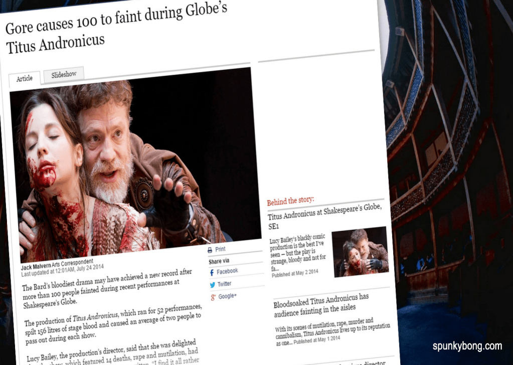 Getting back to Shakespeare’s penchant for gore, his work is replete with mayhem and that’s because Elizabethan audiences reveled in gore. While a good comedy once in a while didn’t do any harm, the 16th century English folk overwhelmingly went for treachery, debauchery, deceit and fountains of blood.
