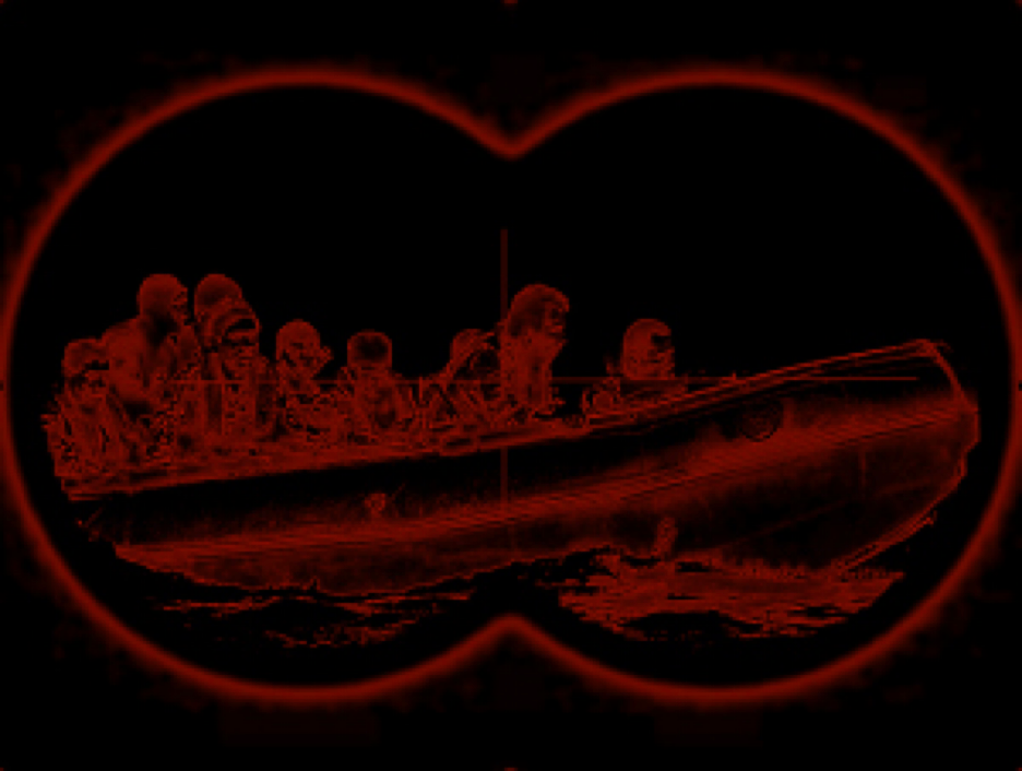 A light catches my eye. It had blinked on briefly some way beyond the surf, making me bring up the Oberwerk and train it in the general direction of the flash. Immediately the two speeding zodiacs fill my eyepiece. There are five of them in each, huddled forms, outlined in an eerie red glow by the night vision of the Oberwerk. Each man seems to be toting a bulky backpack. The two inflatables pitch and bounce on the waves, releasing bursts of spray as they hit the troughs and the crests, racing toward the little strip of sand that borders the jumble of the star-shaped blocks by the seawall. On their heading they’ll be beaching right about a hundred meters from where I am perched.