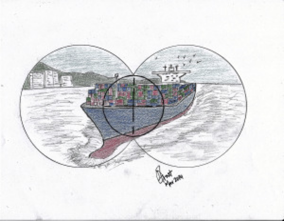 The Japanese container ship I had been following was barely visible now against the afterglow of the sunset. The Amaretsu Maru. I had read the name off the hull with my Oberwerk Ultra. The Oberwerk is mid-range stuff, still way above anything you might find off the shelf at Walmart. It is crystal clear at 5000 meters and the Back Bay is only 3.5 kms wide. The night vision is a bit grainy but still good if you know what you are looking for.