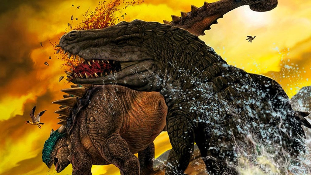 Of the great reptiles all that remain a decade after impact are bits of charred bones, with little pieces of shredded dry skin still clinging on to them. Their innards, soft tissue, are long gone, disintegrated and dissolved into the soil. Under water, the humongous plesiosaurs have been replaced by smaller, 10-ft long reptiles, ancestors of crocodiles.